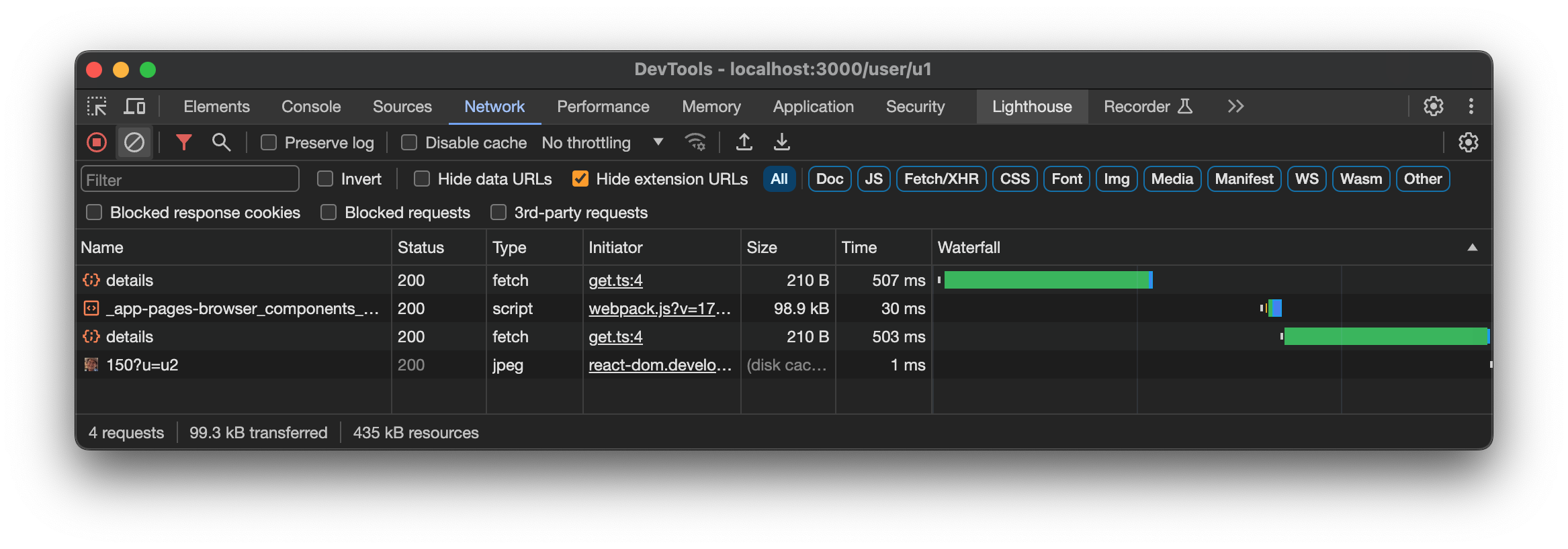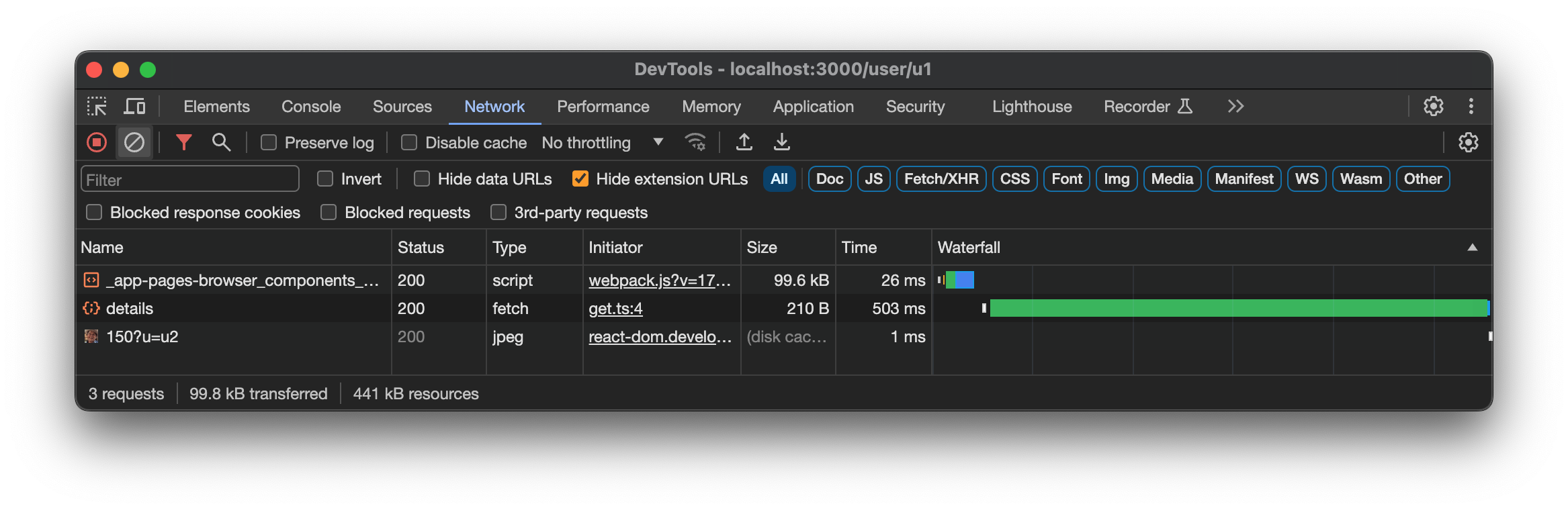 }And when we click a Friend you can see there is an additional request send (for a JavaScript chunk), and then following a network request.